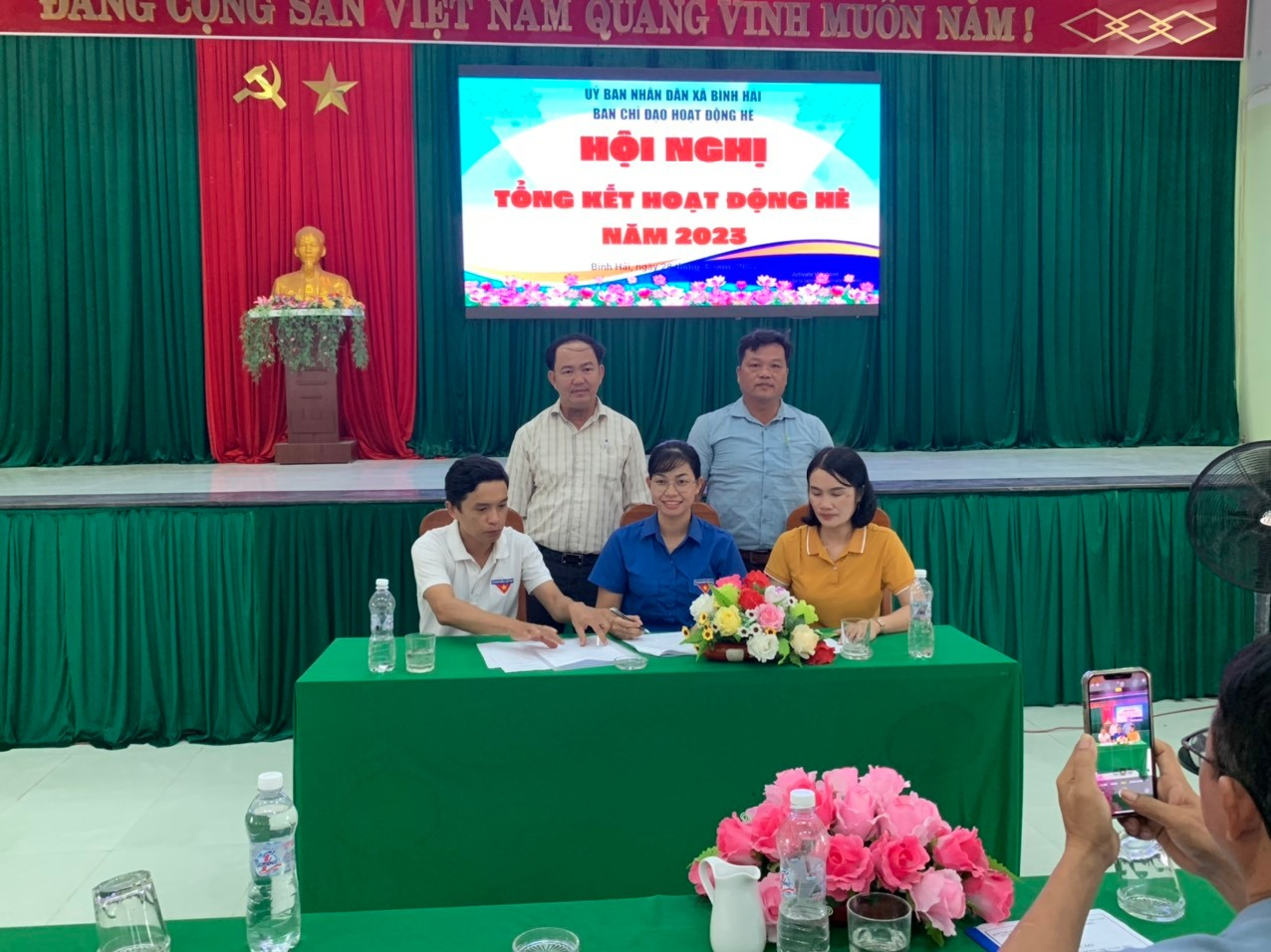 Chiều ngày 28/8/2029 BCĐ hoạt động hè xã Bình Hải tổ chức Hội nghị tổng kết  Hoạt động hè năm 2023. Sau khi kết thúc năm học 2022-2023, BCĐ Hoạt động hè xây dựng kế hoạch tổ chức các hoạt động tuyên truyền như phòng chống xâm hại tình dục, tai nạn thương tích, phòng đuối nước…cho học sinh cấp 1, cấp 2. Tổ chức giải cờ vua cho học sinh khối cấp 1, tổ chức giải cầu lông cho học sinh khối cấp 2, Hội thi vẽ tranh cho học sinh khối cấp 1 và cấp 2, tổ chức giải bóng đá mi ni cho thanh tiếu niên, ngoài ra còn tổ chức các động dộn vệ sinh môi trường bãi biển, nghĩa trang liệt sỹ, các hoạt động đền ơn đáp nghĩa nhân kỷ 76 năm ngày thương binh liệt sỹ(27/7/1947-27/7/2023) như thắp nến tri ân, tặng 2 sổ tiết kiệm trị giá 2.000.000đ cho gia đình chính sách có hoàn cảnh khó khăn, các phong trào thanh niên tham gia tình nguyện như hỗ trợ Công an xã cài đặc định danh điện tử VneID cho nhân dân, hướng dẫn công dân thực hiện đăng ký nộp hồ sơ trực tuyến dịch vụ công tại bộ phận 1 cửa xã. Ngoài ra còn tham gia các hoạt động do huyện tổ chức. Qua các hoạt động tổ chức đã thu hút hàng ngàn lượt các bạn đoàn viên, thanh thiếu niên tham gia, tạo cho các em sân chơi bổ ích, lành mạnh trong dịp hè.