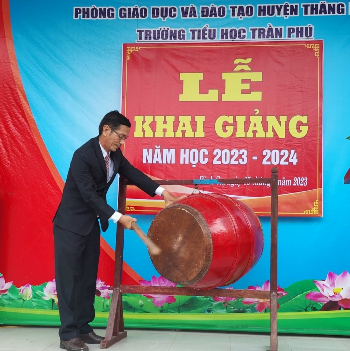 Thầy giáo Phan Quang Trung, HT Trường Tiểu học Trần Phú đánh trống khai trường