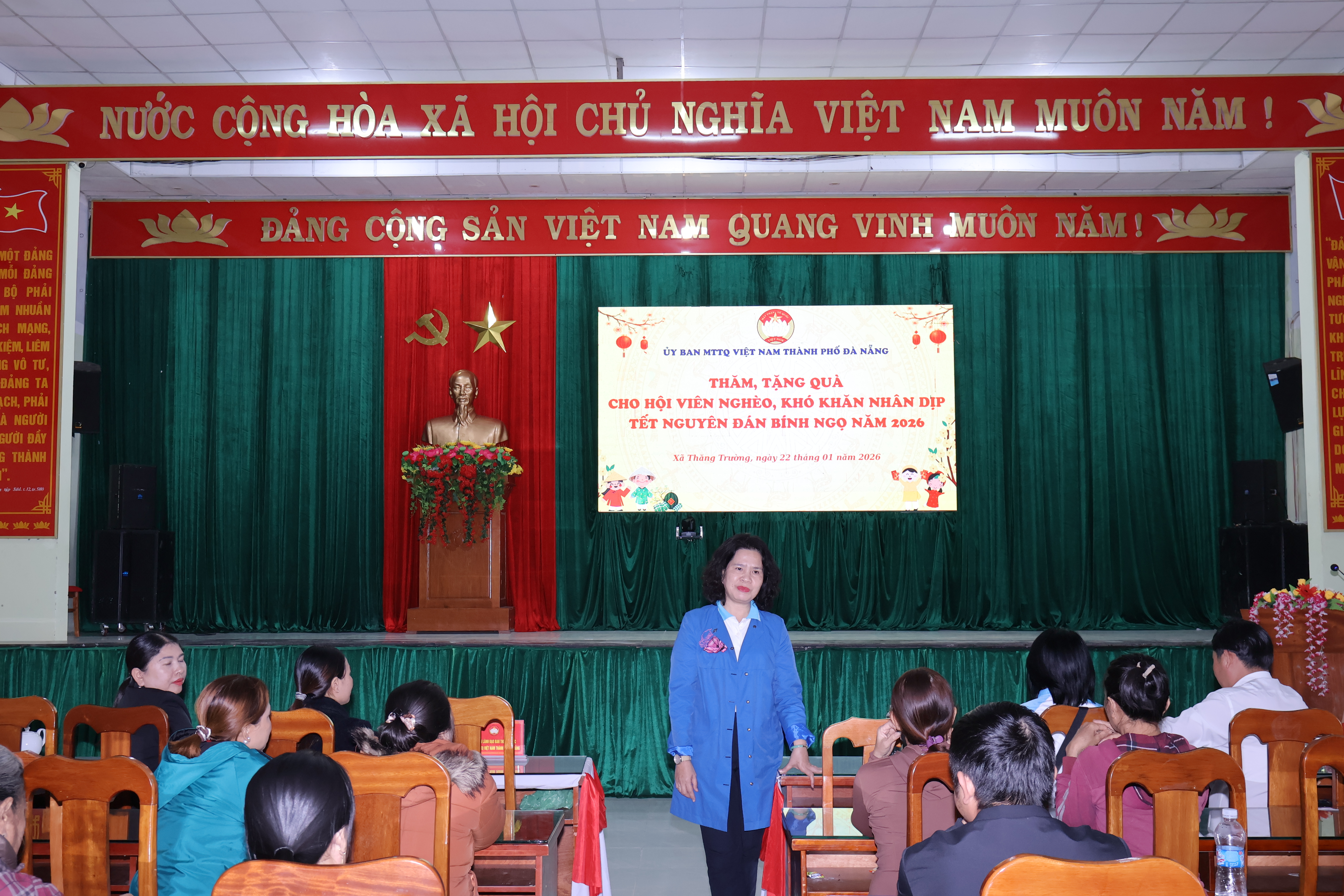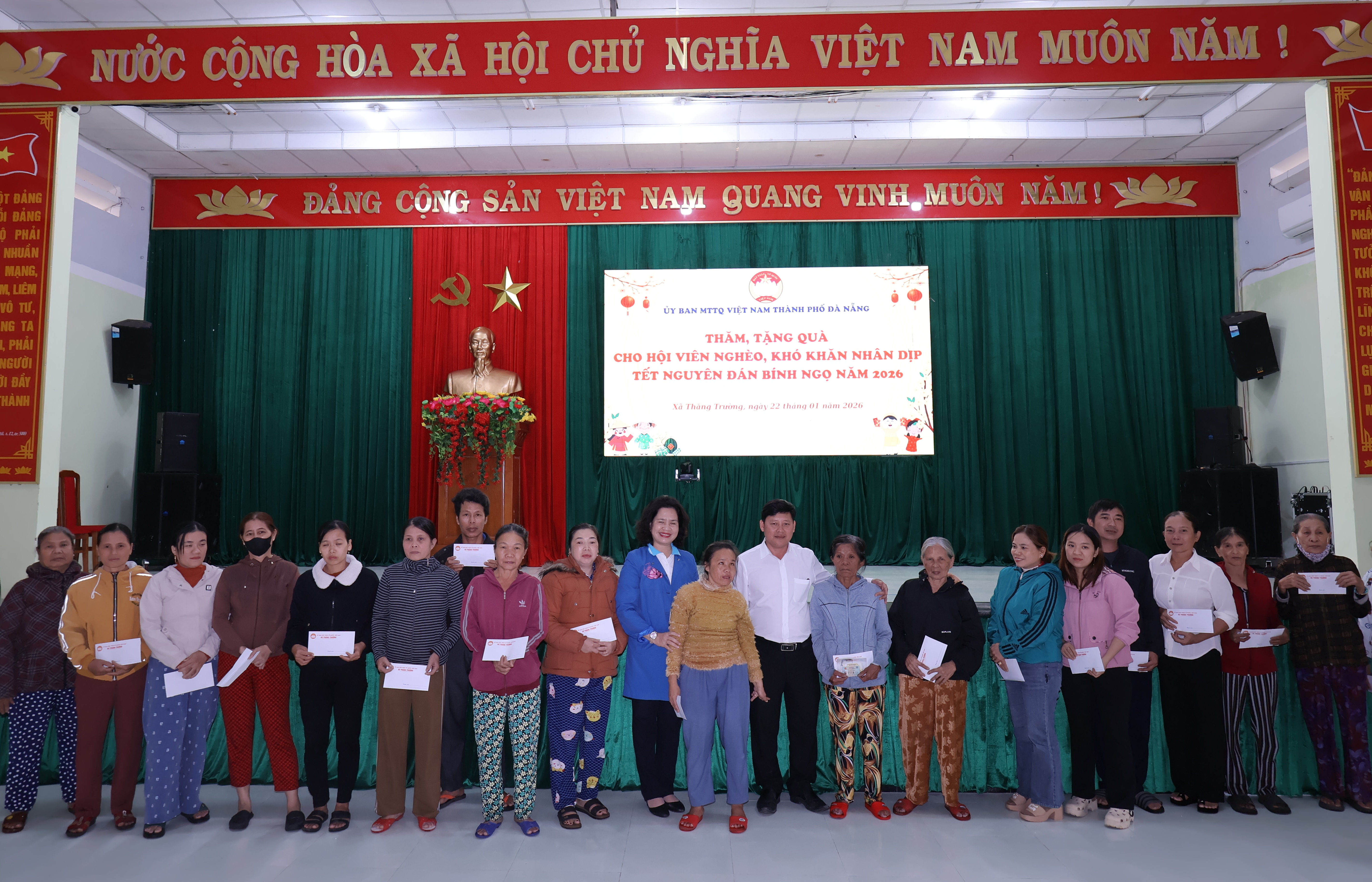 Tại chương trình, đoàn công tác đã trao 25 suất quà, mỗi suất trị giá 1.000.000 đồng, cho 25 hội viên phụ nữ nghèo, có hoàn cảnh khó khăn trên địa bàn xã. Đồng thời, Ủy ban MTTQ Việt Nam TP Đà Nẵng đã trao tặng 01 phần quà cho Hội Liên hiệp Phụ nữ xã Thăng Trường nhằm động viên, ghi nhận những nỗ lực của Hội trong công tác chăm lo, hỗ trợ hội viên phụ nữ thời gian qua.