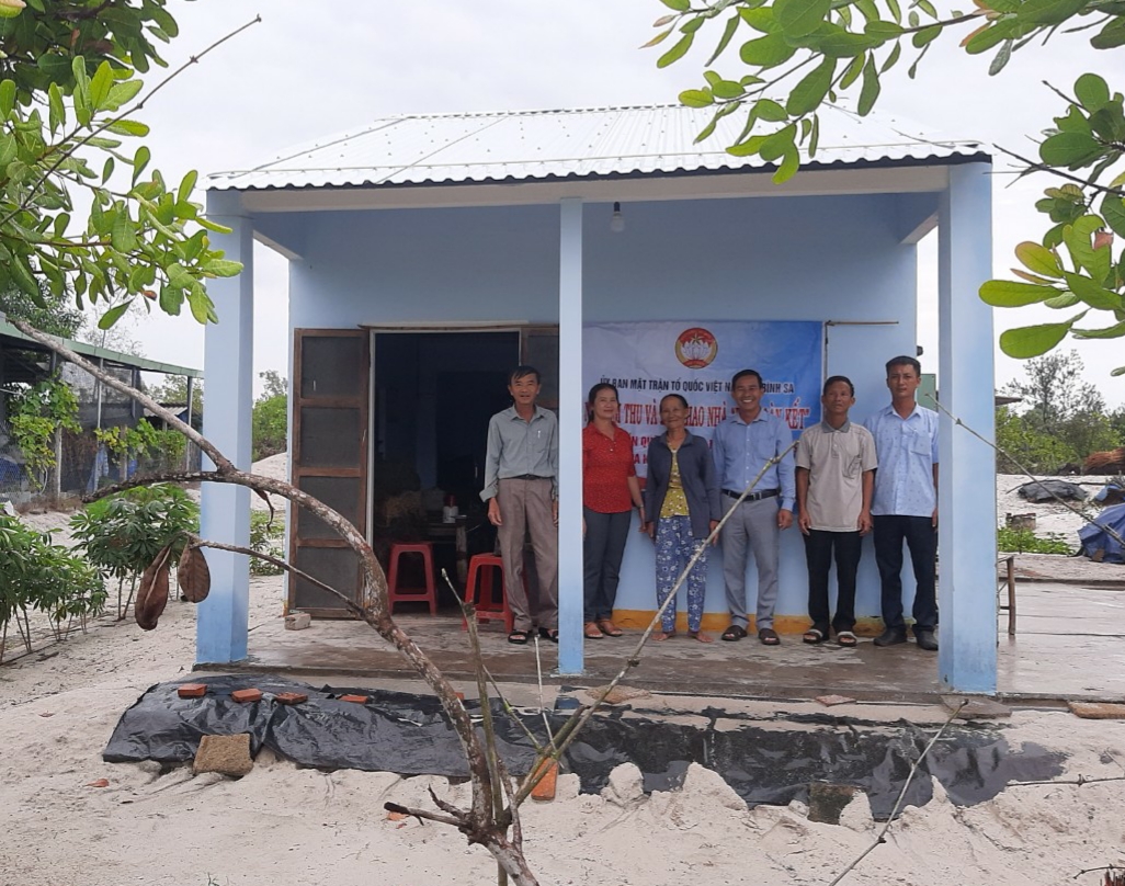 Nhà bà: Bùi Thị Minh, xây mới kinh phí 110 triệu đồng, trong đó Quỹ “Vì người nghèo” của huyện thông qua đơn vị thi công dự án hoàn thiện đường ven biển Võ Chí Công (129) từ Bình Sa đi Đông Quế Sơn hỗ trợ 50 triệu đồng, còn lại gia đình người thân giúp đỡ.