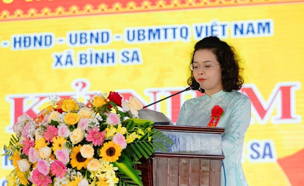 Bí thư Đảng ủy xã Nguyễn Thị Thu Hiền đọc diễn văn tại Lễ kỷ niệm 50 năm ngày giải phóng xã Bình Sa