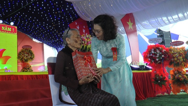 Bí thư Đảng ủy xã Nguyễn Thị Thu Hiền tặng quà Mẹ VNAH Trịnh Thị Hiệp.