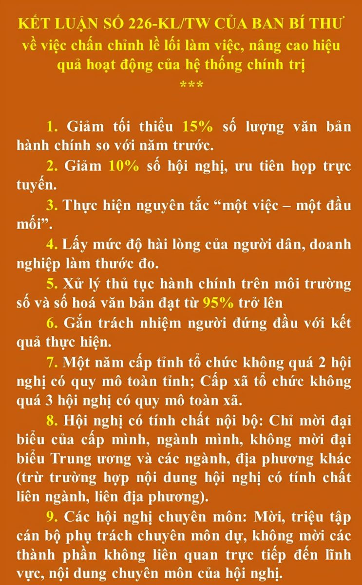 Các cấp uỷ, tổ chức đảng, cơ quan, địa phương, đơn vị căn cứ tình hình thực tiễn, hằng năm phải xây dựng kế hoạch tổ chức hội nghị phù hợp; trong đó, số hội nghị trực tiếp không quá 40%, hội nghị trực tuyến không ít hơn 60% tổng số hội nghị. Không tổ chức hội nghị khi không thật sự cần thiết hoặc nội dung đã được hướng dẫn bằng văn bản; thực hiện tinh giản tối thiểu 10% số lượng hội nghị hằng năm. Kết luận cũng quy định rõ giới hạn về quy mô, số lượng hội nghị toàn tỉnh, toàn xã; xác định chặt chẽ thành phần tham dự theo nguyên tắc đúng khối, đúng chức năng, nhiệm vụ; không mời tràn lan, không mời các thành phần không liên quan trực tiếp. Cụ thể: