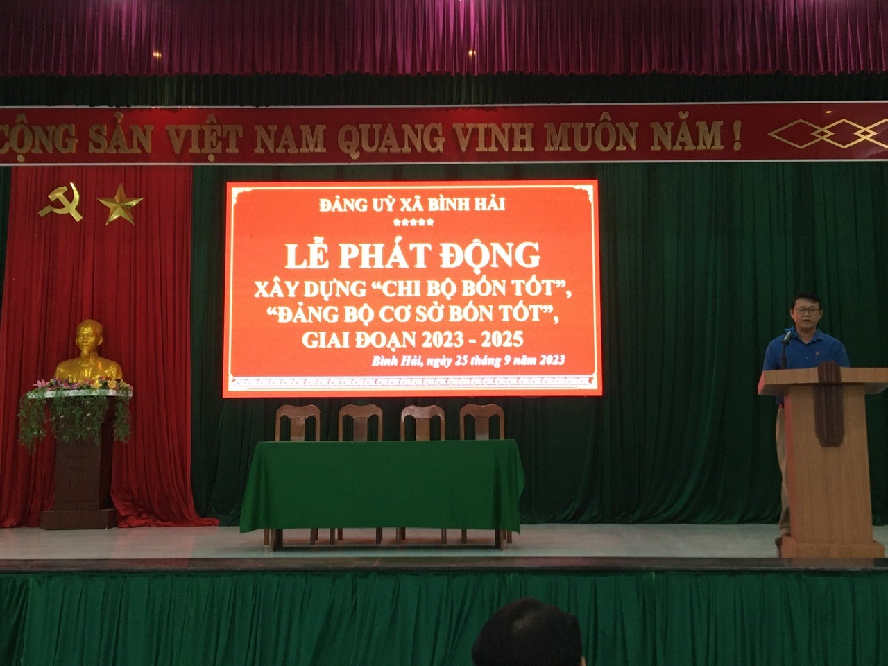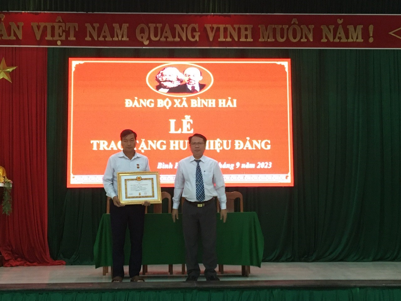 Sáng ngày 25/9/2023, Đảng ủy xã Bình Hải tổ chức Lễ trao Huy hiệu 30 năm tuổi Đảng cho đảng viên; tổ chức quán triệt, ký kết giao ước thi đua xây dựng "chi bộ bốn tốt”, “đảng bộ cơ sở bốn tốt” giai đoạn 2023-2025 và trao thưởng cho thí sinh tham gia Hội thi tuyên truyền viên giỏi năm 2023. Tham dự Lễ phát động có các đồng chí trong Ban Thường vụ, Ban chấp hành Đảng bộ xã khóa XIV; và Bí thư, Phó Bí thư, chi ủy viên của 09 chi bộ trực thuộc, đảng viên là cán bộ, công chức xã, các thí sinh tham gia Hội thi tuyên truyền viên giỏi năm 2023.
