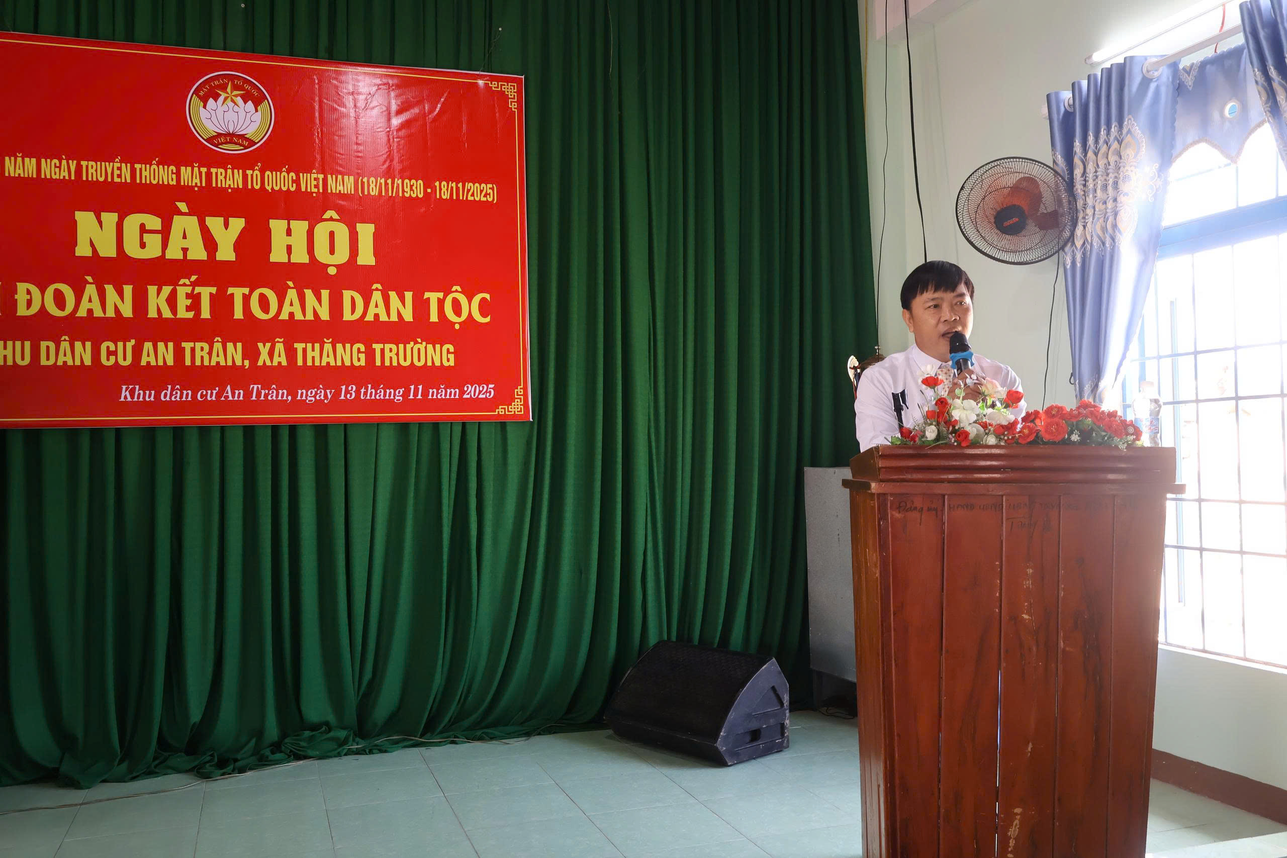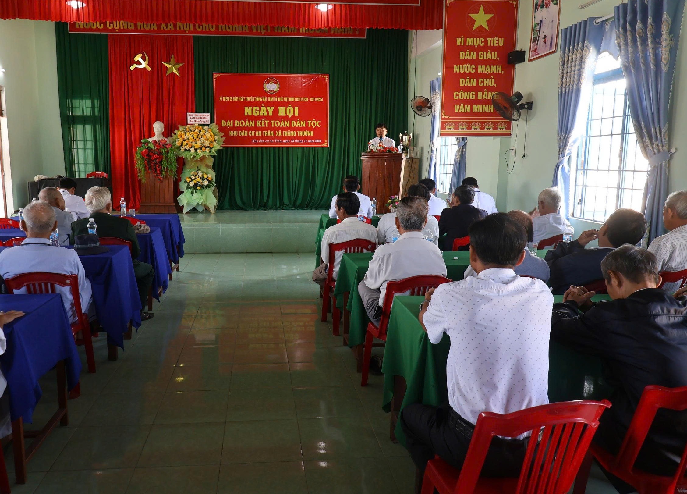 Phát biểu tại Ngày hội, đồng chí Võ Tấn Thuận – Bí thư Đảng ủy xã đã biểu dương những kết quả đạt được. Đó là sự nỗ lực, phấn đấu, đóng góp to lớn của cán bộ thôn tổ cùng bà con nhân dân thôn An Trân. Đồng thời đồng chí đề nghị nhân dân tiếp thu phát huy tinh thần đoàn kết, thực hiện hiệu quả cuộc vận động “Toàn dân đoàn kết xây dựng nông thôn mới, đô thị văn minh”; đẩy mạnh chuyển đổi cơ cấu cây trồng, vật nuôi; chú trọng phát triển kinh tế biển theo hướng vươn khơi đánh bắt xa bờ để tăng giá trị thu nhập, phát triển nuôi trồng thủy sản gắn với bảo vệ môi trường; đẩy mạnh phong trào toàn dân bảo vệ an ninh tổ quốc, tố giác tội phạm đặc biệt trong phòng chống ma túy…..