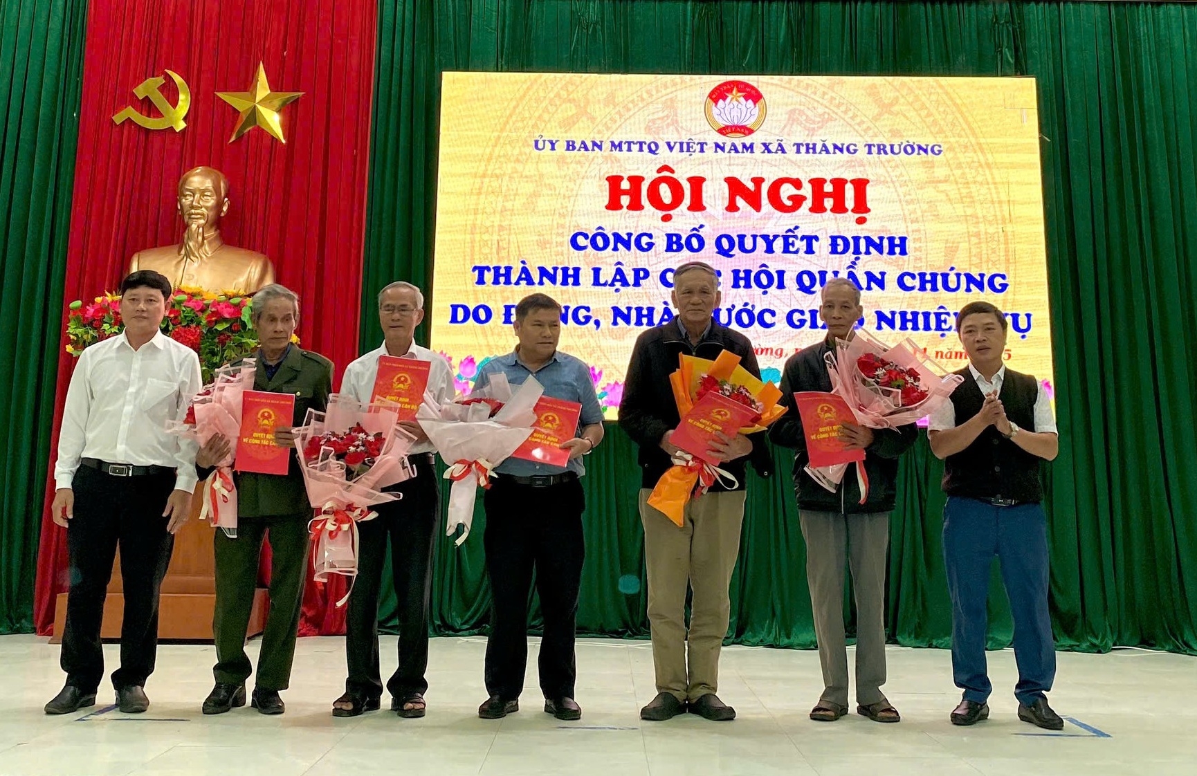 Đ/c Võ Tấn Thuận - Bí thư Đảng ủy xã, đ/c Nguyễn Xuân Hợi - Chủ tịch UBMTTQVN xã trao Quyết định và tặng hoa chúc mừng đại diện các Hội quần chúng