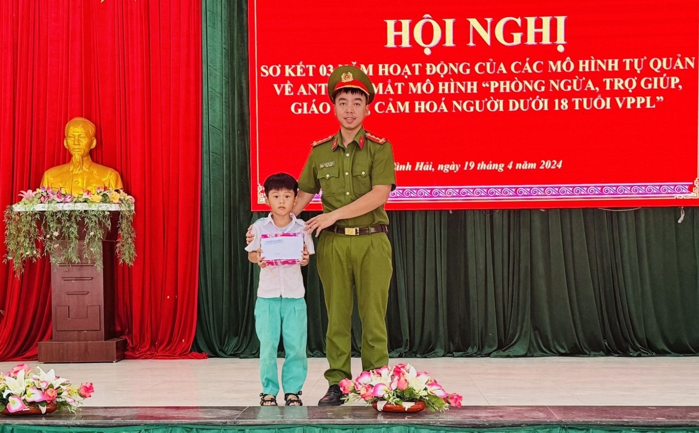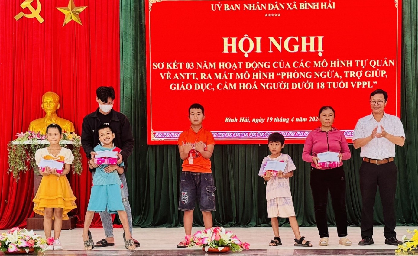 Dịp này, Công an xã Bình Hải đã nhận đỡ đầu em Hoàng Trần Thiên Phúc, (2015), là học sinh trường Tiểu học Thái Phiên, mỗi tháng 300.000 đồng.