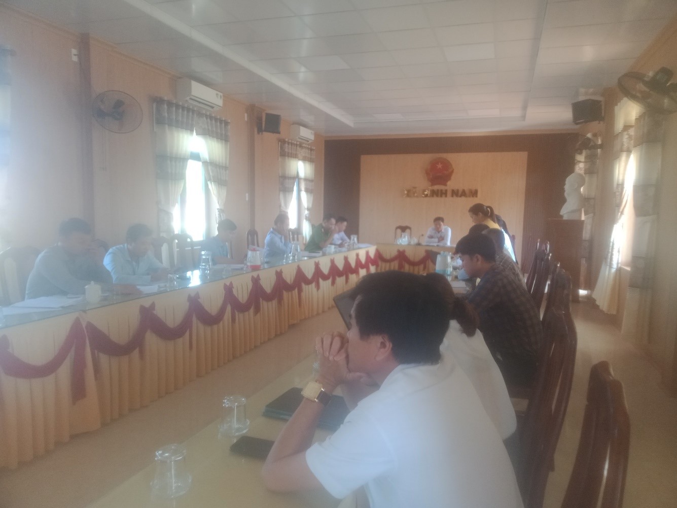 Chủ trì cuộc họp có Ông Phạm Công Quốc: Chủ tịch UBND xã. Tham dự cuộc họp có bà Ung Thị Diễm; PCT HĐND xã