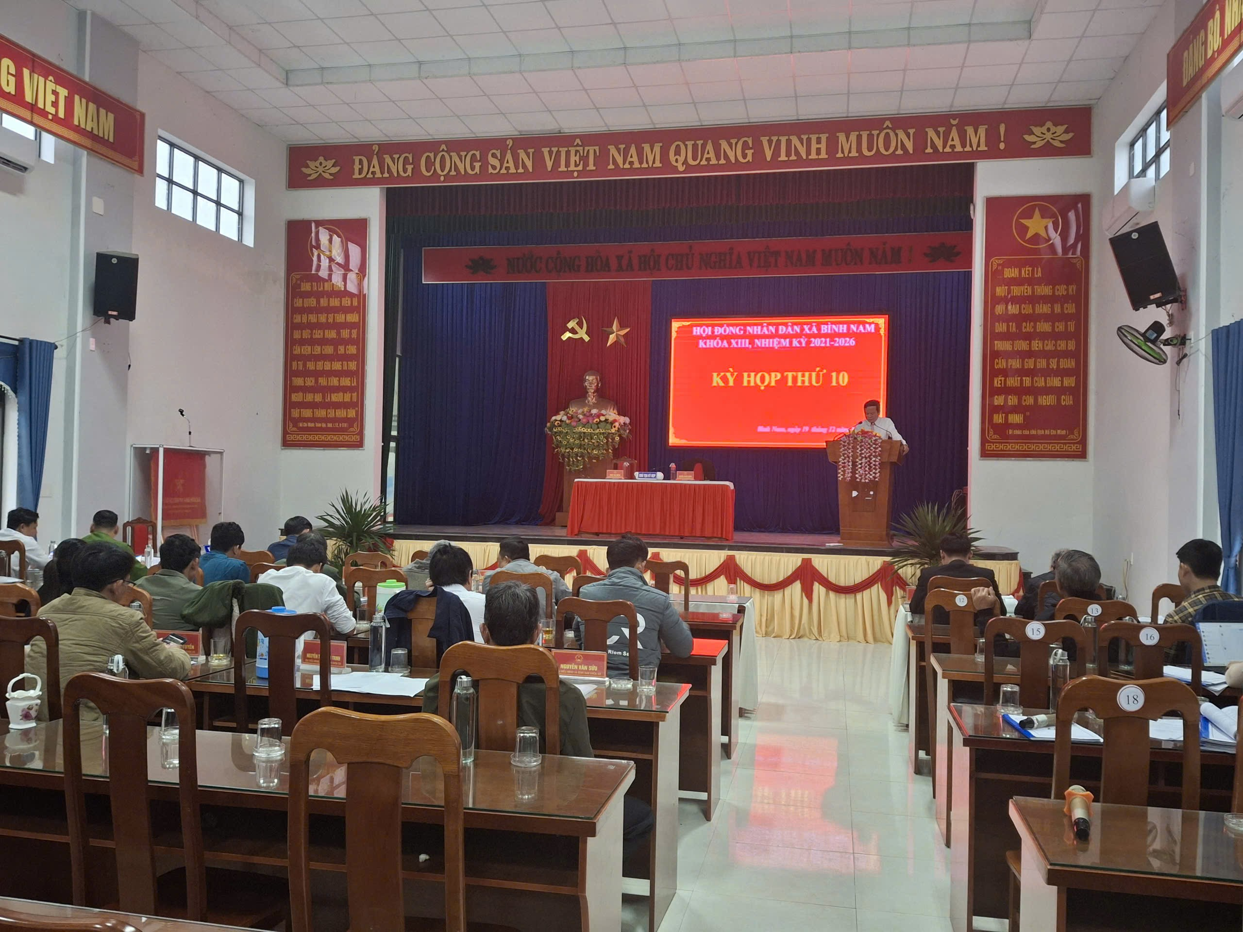 Qua các báo cáo của HĐND, UBND xã, kỳ họp đã thảo luận và thống nhất thông qua 06 Nghị quyết cụ thể: Nghị quyết Nghị số 09/NQ-HĐND ngày 19/12/2024 về nhiệm vụ phát triển Kinh tế- xã hội, An ninh- Quốc phòng năm 2025; Nghị quyết số 10/NQ-HĐND ngày 19/12/2024 phân rã dự toán thu- chi ngân sách Nhà nước 2025; Nghị quyết số 13/NQ-HĐND ngày 19/12/2024 về quyết định các biện pháp bảo đảm thực hiện dân chủ cơ sở trên địa bàn xã Bình Nam; Nghị quyết số 12/NQ-HĐND ngày 19/12/2024 về thành lập Đoàn giám sát chuyên đề năm 2025 của Hội đồng nhân dân xã Bình Nam; Nghị quyết số 11/NQ-HĐND ngày 19/12/2024 về Kế hoạch tổ chức các kỳ họp trong năm 2025 của Hội đồng nhân dân xã khóa XIII, nhiệm kỳ 2021-2026; Nghị quyết số 14/NQ-HĐND ngày 19/12/2024 về Kỳ họp thứ 10, Hội đồng nhân dân xã khóa XIII.