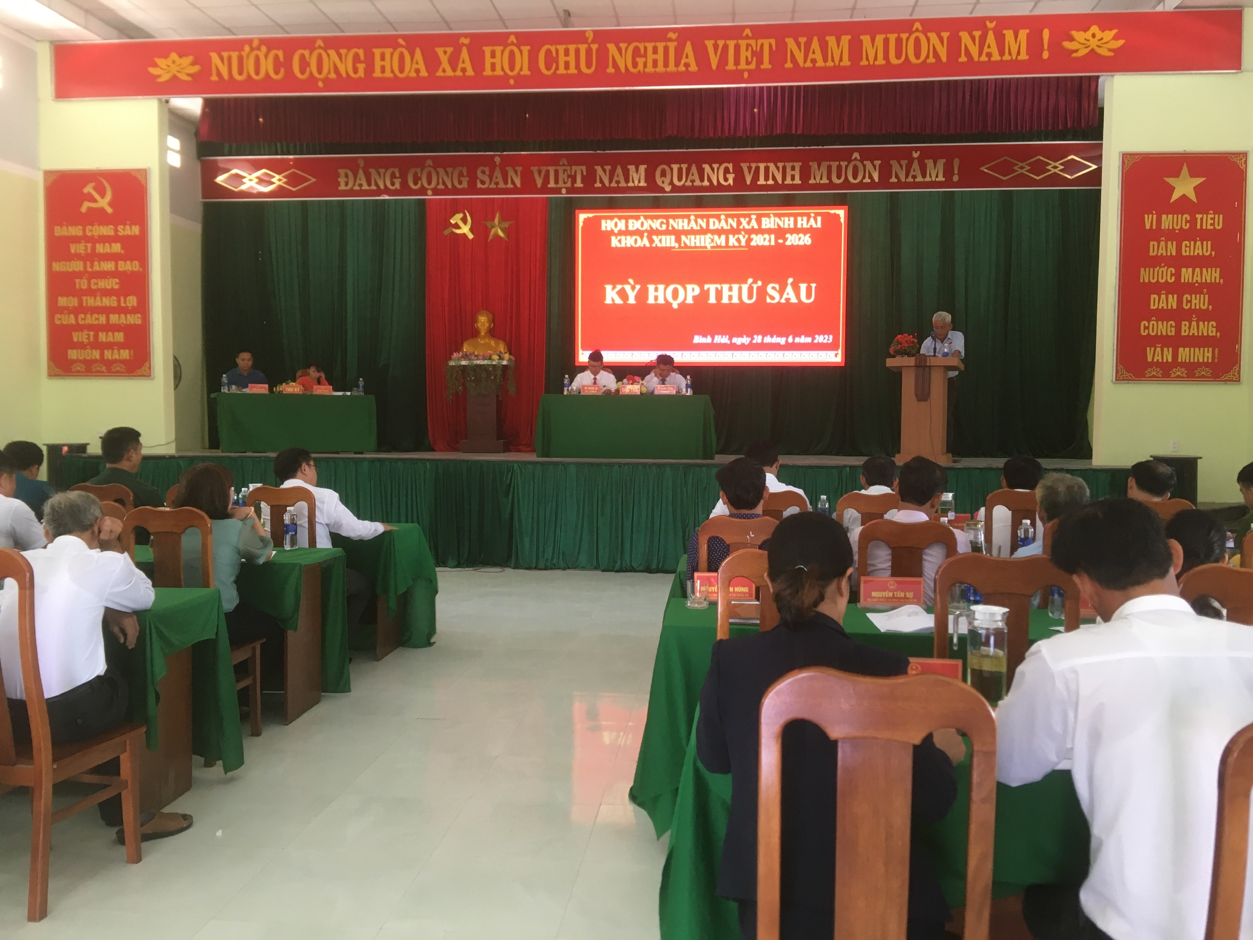 Sáng ngày 28/6/2023, HĐND xã Bình Hải tổ chức kỳ họp thứ sáu HĐND xã khoá XIII, nhiệm kỳ 2021 -2026. Dự kỳ họp có đồng chí Trung tá Lê Văn Nam - Chính trị viên Đồn Biên phòng Bình Minh; Đ/c Nguyễn Tấn Thu - HUV - Bí Thư Đảng ủy; Đ/c Hồ Thanh Tư- PBT, CT HĐND; Đ/c Nguyễn Văn Châu- PBT, CT UBND; Đ/c Trần Tấn Can - UVBTV - CTUBMTTQVN xã; các ban, ngành, hội đoàn thể; Đại biểu 03 trường học, Trạm y tế, HTX NN xã Bình Hải; Đại biểu Ban hộ tự 02 chùa Phật giáo; các đồng chí là Bí thư chi bộ, trưởng thôn, trưởng ban công tác mặt trận của 04 thôn và 25 đại biểu HĐND xã khoá XIII, nhiệm kỳ 2021-2026.