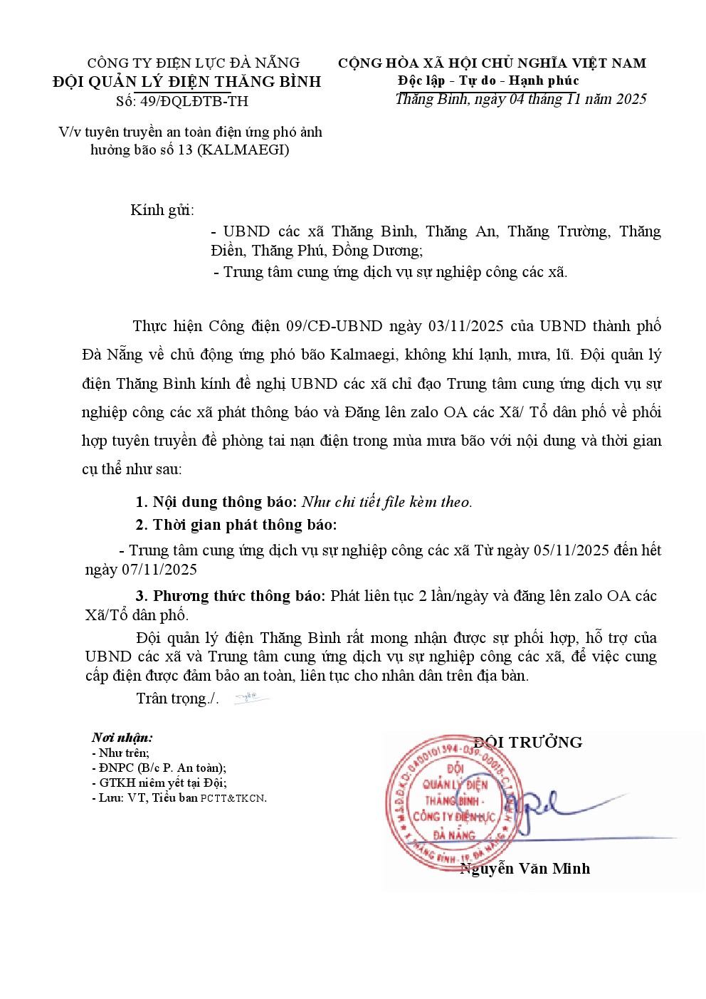 Công văn về việc tuyên truyền an toàn điện ứng phó ảnh hưởng bão số 13 (KALMAEGI)