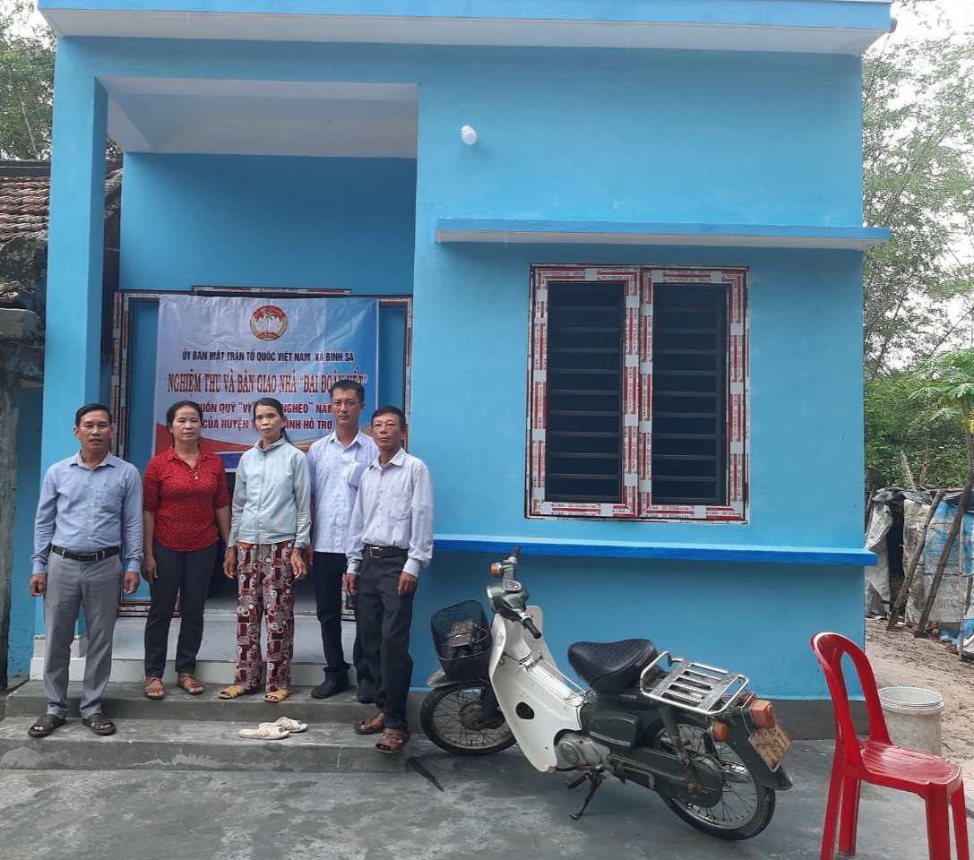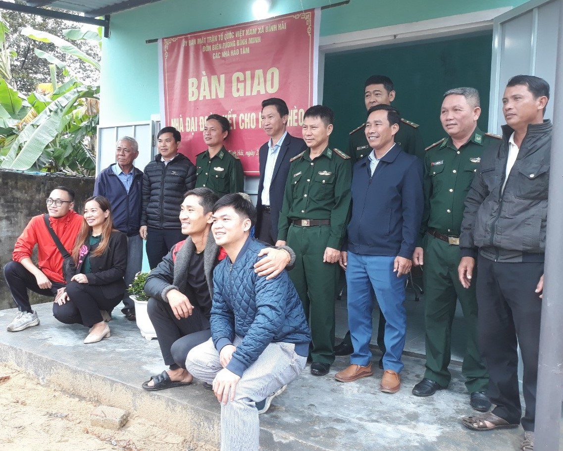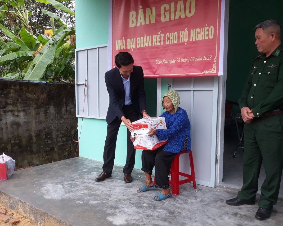 Ngày 28/02/2023, Ban Thường trực Ủy ban MTTQ Việt Nam xã Bình Hải chủ trì, phối hợp tổ chức bàn giao nhà đại đoàn kết cho hộ bà Nguyễn Thị Thừa tại tổ 4 - thôn Phước An. Tham dự lễ bàn giao có ông Nguyễn Thanh Phong - UVBTV, Chủ tịch Ủy ban MTTQ Việt Nam huyện; ông Đinh Sỹ Công – Đồn Trưởng, ông Lê Văn Nam - Chính trị viên, Bí thư Chi bộ Đồn Biên phòng Bình Minh; ông Hoàng Thanh Hùng – Phó Chủ tịch UBND xã; các nhà hảo tâm gồm bà Nguyễn Thị Thùy Dương, ông Nguyễn Tim và đại diện hộ gia đình.