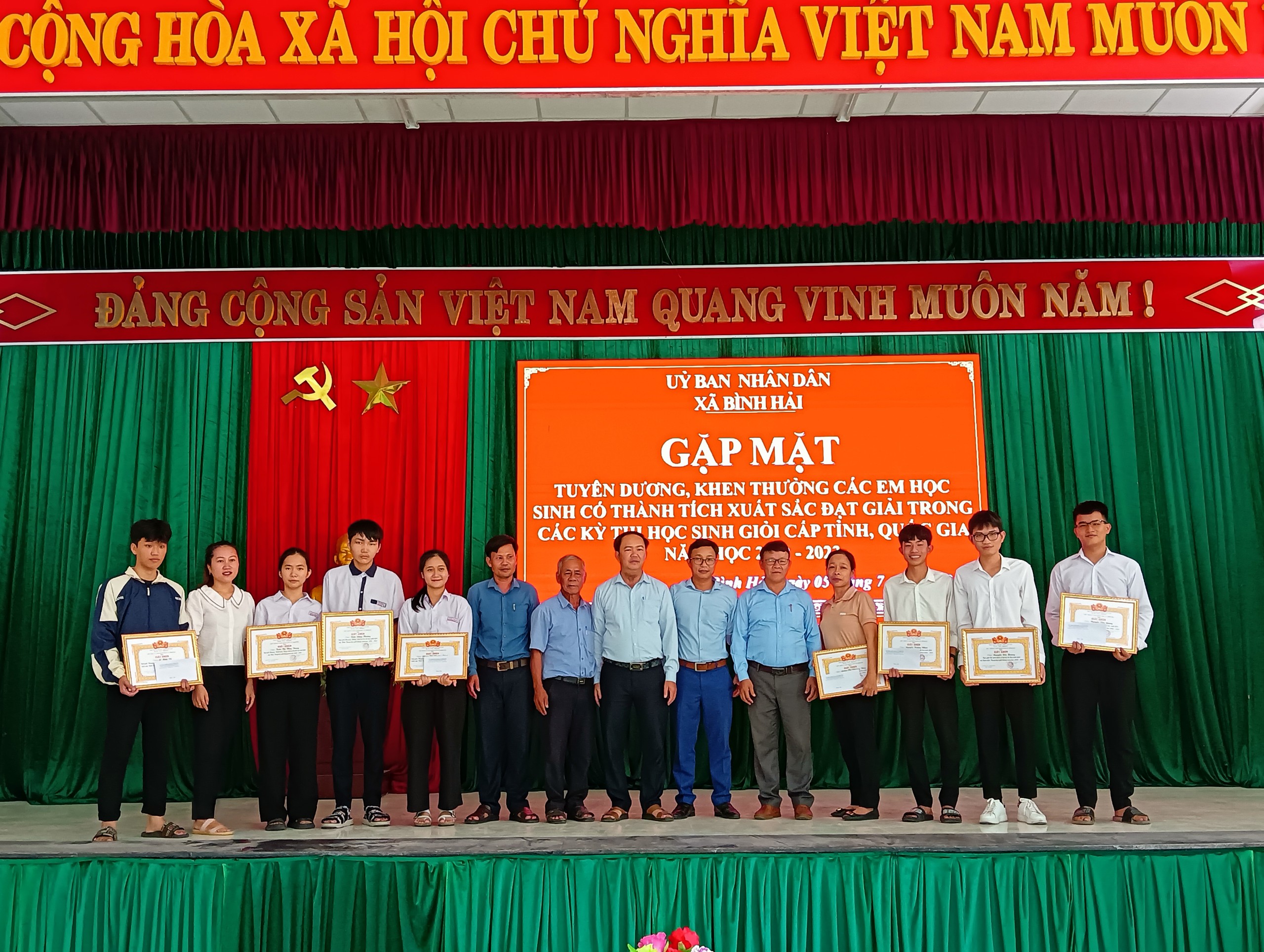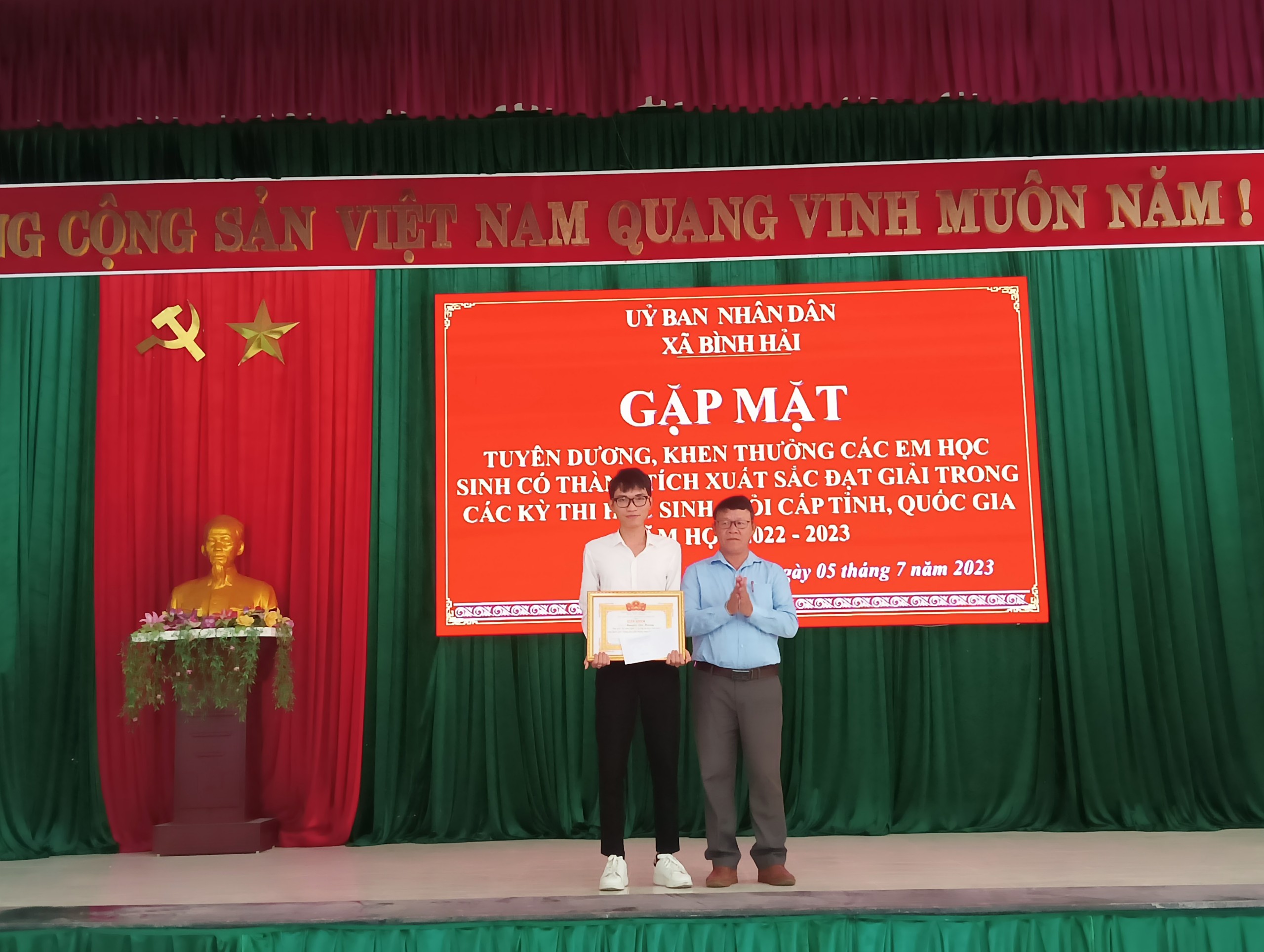 Chiều ngày 5/7/2023 UBND xã Bình Hải tổ chức tuyên dương, khen thưởng các em học sinh có thành tích xuất sắc trong các Kỳ thi học sinh giỏi cấp tỉnh, Quốc gia năm học 2022-2023. Trong năm học 2022-2023 xã Bình Hải có 9 em học sinh ở cấp THCS và THPT đạt giải trong các Kỳ thi học sinh giỏi cấp tỉnh và có em Nguyễn Đức Hoàng, học sinh trường chuyên Nguyễn Bỉnh Khiêm đạt giải Ba trong kỳ thi học sinh giỏi cấp Quốc gia môn Lịch sử.