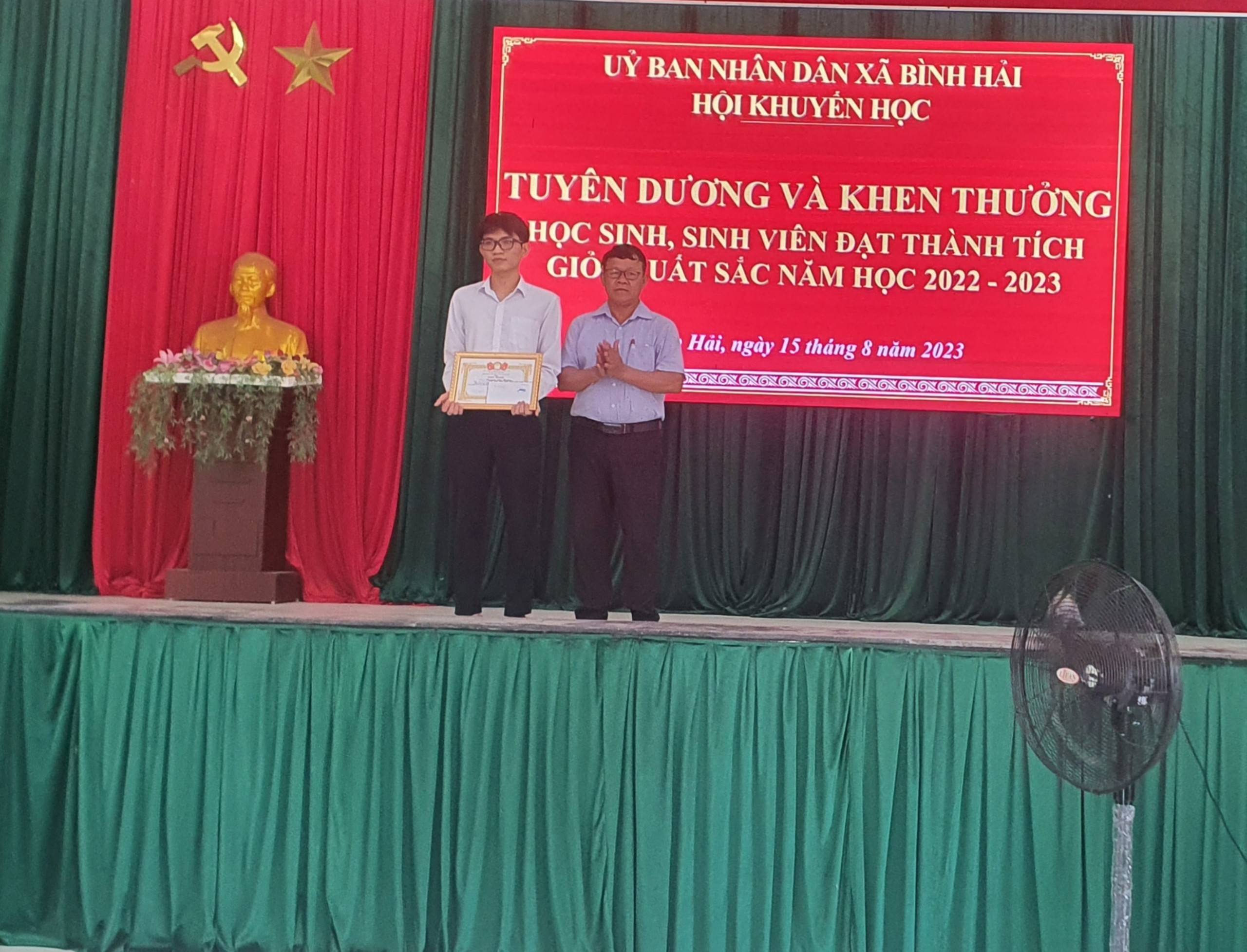 Chiều ngày 16/8/2023 Hội khuyến học xã Bình Hải tổ chức Tuyên dương khen thưởng cho học sinh, sinh viên năm học 2022-2023. Năm học 2022-2023 xã Bình Hải có 66 em học sinh cấp III và sinh viên đạt học sinh giỏi, suất sắc trong đó có 08 em đạt giải trong kỳ thi học sinh giỏi cấp tỉnh và 01 em đạt giải 03 trong kỳ thi học sinh giỏi cấp Quốc gia môn lịch sử.