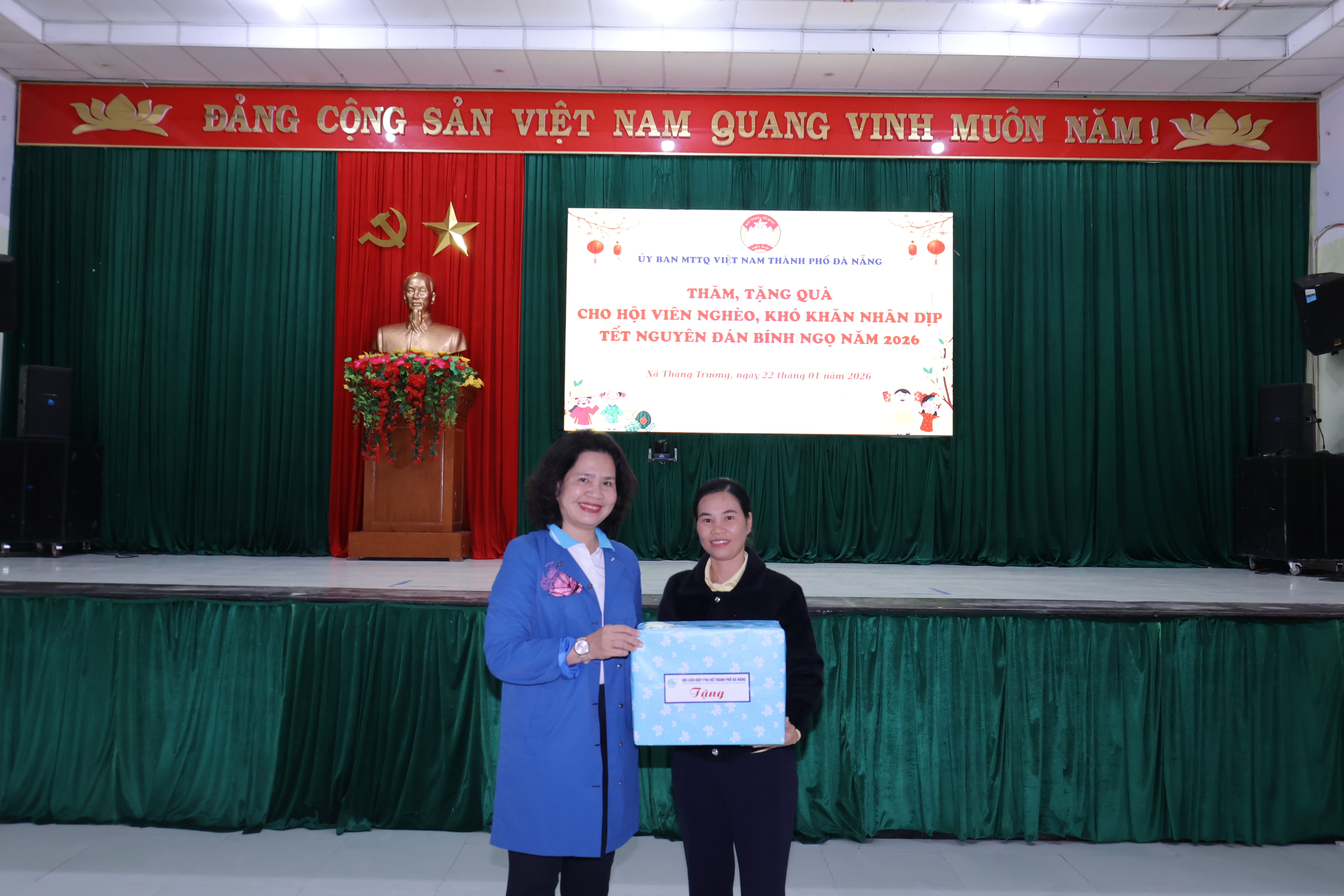 Tại chương trình, đoàn công tác đã trao 25 suất quà, mỗi suất trị giá 1.000.000 đồng, cho 25 hội viên phụ nữ nghèo, có hoàn cảnh khó khăn trên địa bàn xã. Đồng thời, Ủy ban MTTQ Việt Nam TP Đà Nẵng đã trao tặng 01 phần quà cho Hội Liên hiệp Phụ nữ xã Thăng Trường nhằm động viên, ghi nhận những nỗ lực của Hội trong công tác chăm lo, hỗ trợ hội viên phụ nữ thời gian qua.