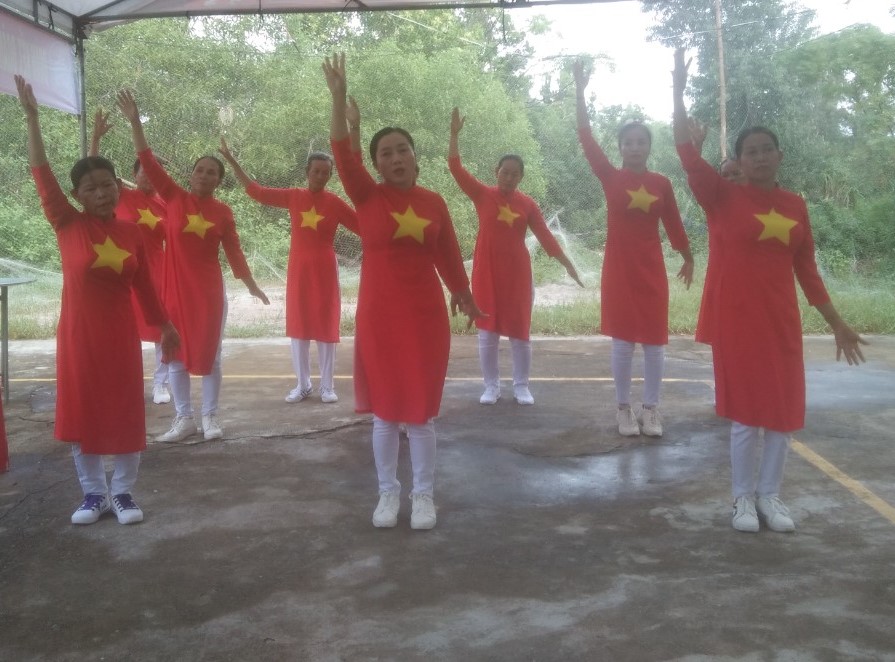Tiết mục múa dân vũ do chị em Phụ nữ thôn nhà biểu diển chào mừng ngày hội
