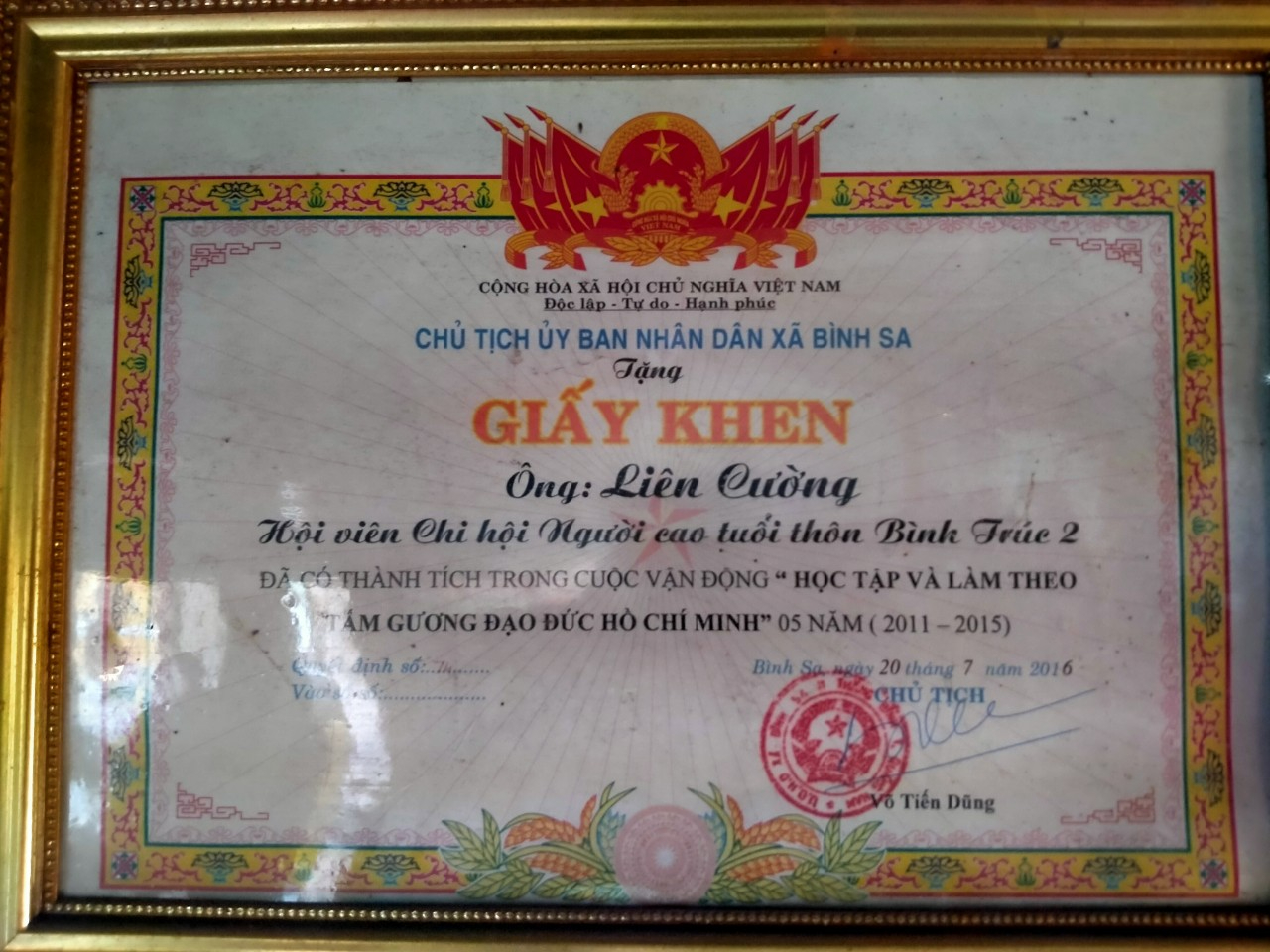 Ông Mai Văn Thanh – Bí thư chi bộ thôn Bình Trúc cho biết Ông Liên Cường là công dân gương mẫu trong thôn, đã đóng góp kinh phí để cùng với nhân dân làm đường giao thông nông thôn, hiến đất đai, cây cối để xây dựng kênh Tứ Sơn, luôn đi đầu trong việc đóng góp các khoản nghĩa vụ nhà nước, gia đình ông luôn là gia đình văn hóa tiêu biểu trong khu dân cư.