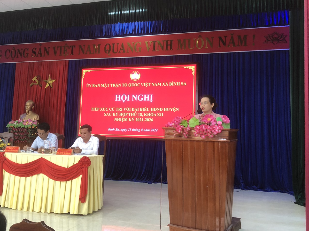 Thay mặt tổ đại biểu HĐND huyện, bà Nguyễn Thị Thu Hiền - Bí thư Đảng ủy xã Bình Sa đã tiếp thu và giải trình các ý kiến của cử tri. Đối với những nội dung thuộc thẩm quyền của huyện sẽ được tổng hợp và chuyển đến cơ quan có thẩm quyền giải quyết.