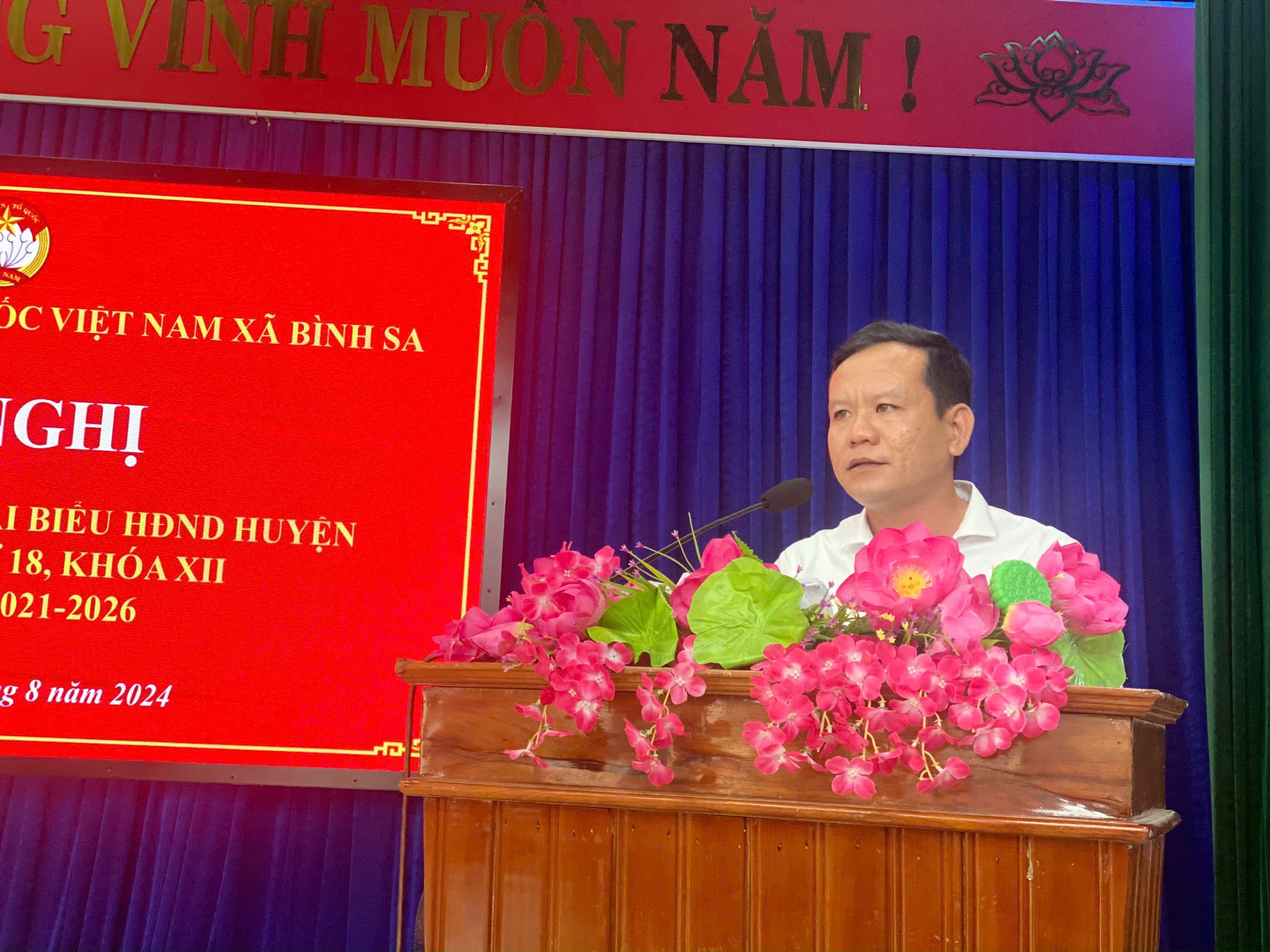 Thay mặt tổ đại biểu HĐND huyện, ông Nguyễn Thanh Hoàng - Bí thư Đảng ủy xã Bình Nam báo cáo với cử tri những nội dung chủ yếu của kỳ họp thứ 18 HĐND huyện khóa XII; thông tin tình hình phát triển kinh tế - xã hội, quốc phòng - an ninh huyện 6 tháng đầu năm 2024, nhiệm vụ trọng tâm 6 tháng cuối năm 2024 cùng các nghị quyết được HĐND huyện ban hành; thông tin về kết quả trả lời những ý kiến, kiến nghị của cử tri xã Bình Sa.
