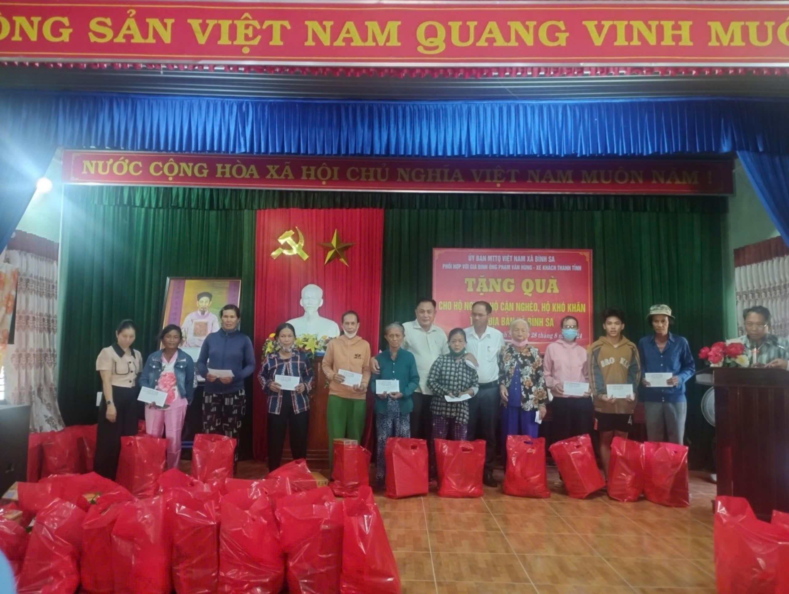 Mỗi xuất quà trị giá 500.000 đồng (trong đó hiện vật trị giá 300.000đ, tiền mặt 200.000đ), tổng kinh phí trên 100 triệu đồng. Đây là những phần quà được anh Phạm Văn Hùng là người con của Bình Sa đang sinh sống và công tác tại Thành Phố Hồ Chí Minh hỗ trợ thông qua chương trình kết nối yêu thương. Việc trao tặng các phần có ý nghĩa hết sức quan trọng, thể hiện tinh thần lá lành đùm lá rách, chia sẽ khó khăn đối với những hộ nghèo, cận nghèo, khó khăn trên địa bàn xã./.