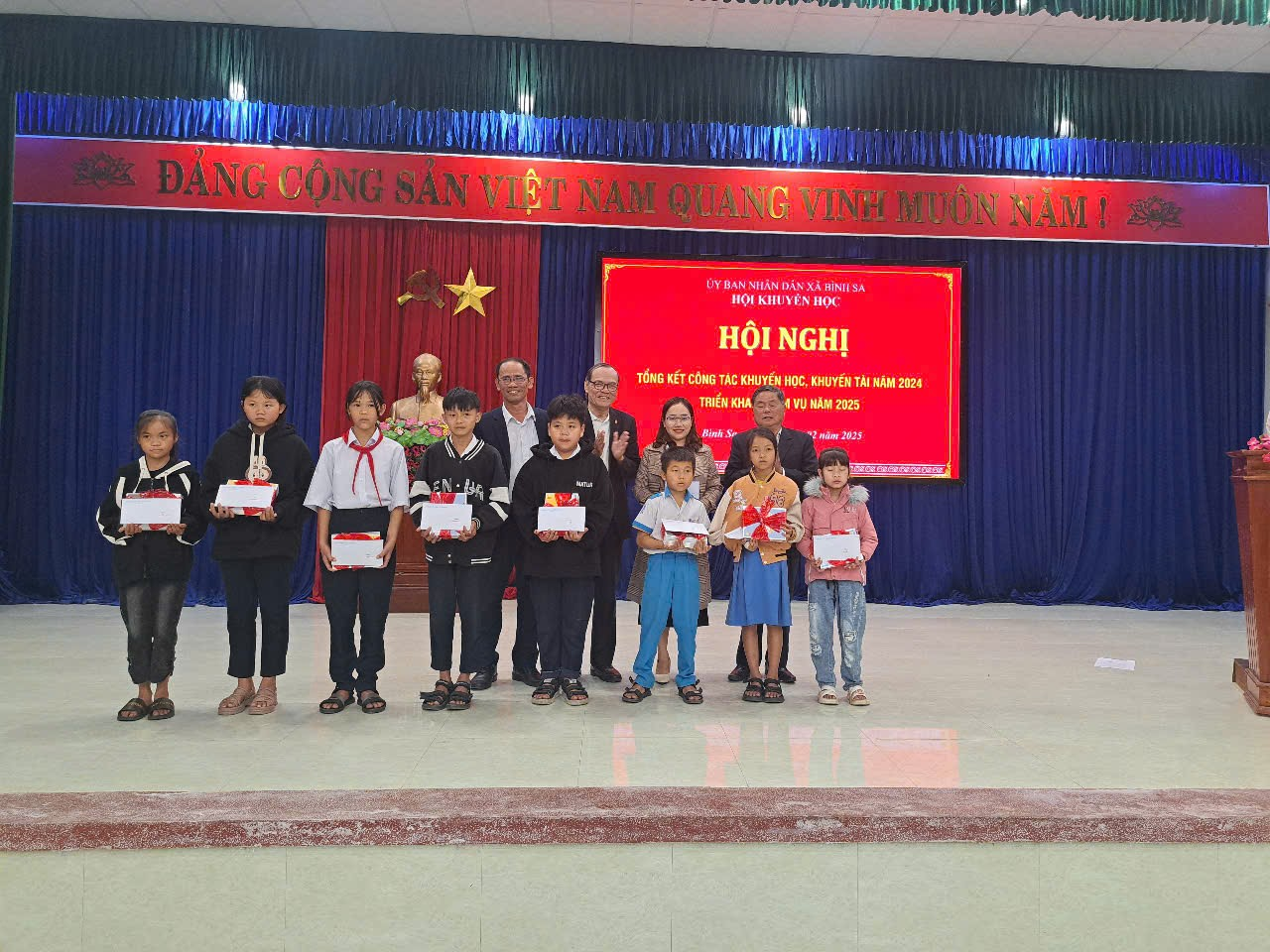 Theo đánh giá năm 2024 công tác khuyến học của xã đạt được những kết quả quan trọng, đã xây dựng mô hình xã hội học tập, trong đó gia đình học tập được công nhận 197/1650; dòng họ học tập 11/35 dòng tộc; cộng đồng học tập 5/5; đơn vị học tập 4/4; đã tổ chức thành công đêm văn nghệ “Chắp cánh ước mơ” huy động quỹ 168.900.000đ…Tại hội nghị đã trao 10 xuất quà cho các em học sinh có hoàn cảnh khó khăn mỗi xuất quà trị giá 500.000đ. Nhân dịp này Trung tướng Châu Văn Mẫm đã tặng trường Mẫu Giáo Bình Sa số tiền 5.000.000đ để mua sắn trang thiết bị phục vụ việc dạy và học cho các cháu./.