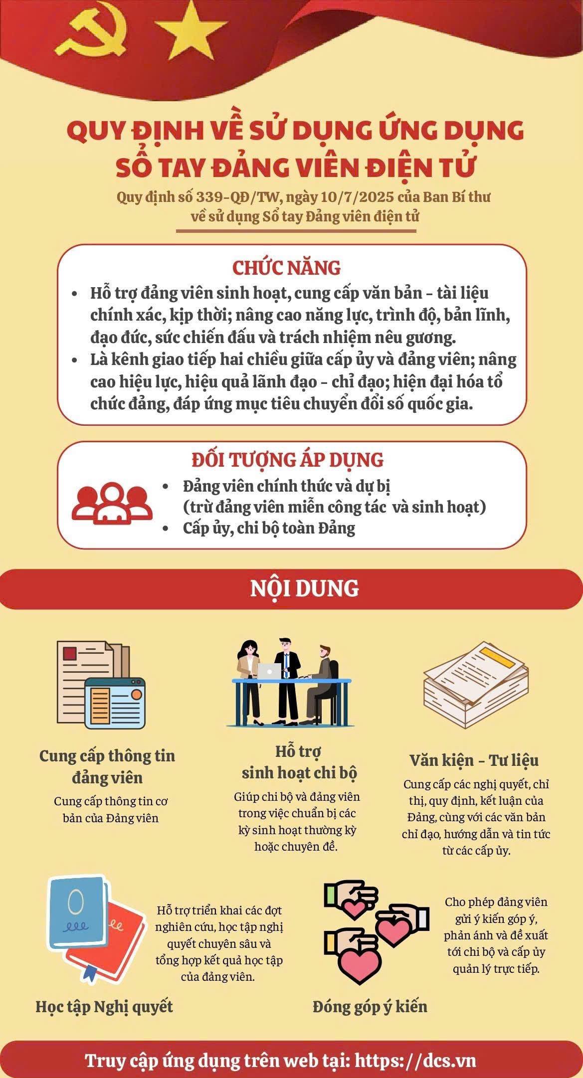 Ngày 10/7/2025 Ban Bí thư Trung ương Đảng ban Quy định số 339-QĐ/TW quy định sử dụng sổ tay đảng viên điện tử, đây là một giải pháp đột phá, mang lại hiệu quả cao trong công tác quản lý đảng viên và nâng cao chất lượng sinh hoạt Đảng.Trong bối cảnh công nghệ thông tin ngày càng phát triển, việc số hóa các hoạt động, tài liệu trở thành một xu thế tất yếu. Nhằm nâng cao hiệu quả quản lý và sinh hoạt của các đảng viên, Đảng ta đã triển khai chương trình "Sổ tay Đảng viên điện tử" - một công cụ hữu ích giúp đảng viên tiếp cận nhanh chóng, tiện lợi với thông tin, tài liệu của Đảng.