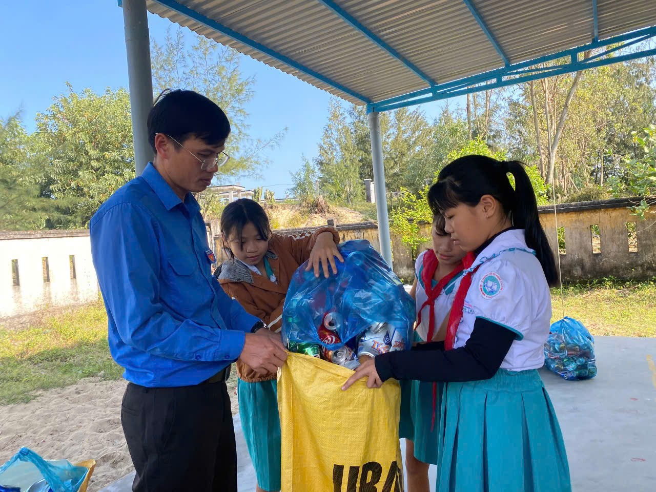 (Đ/c Lê Thống Nhất – BT Đoàn xã, cùng các em học sinh thu gom vỏ lon)