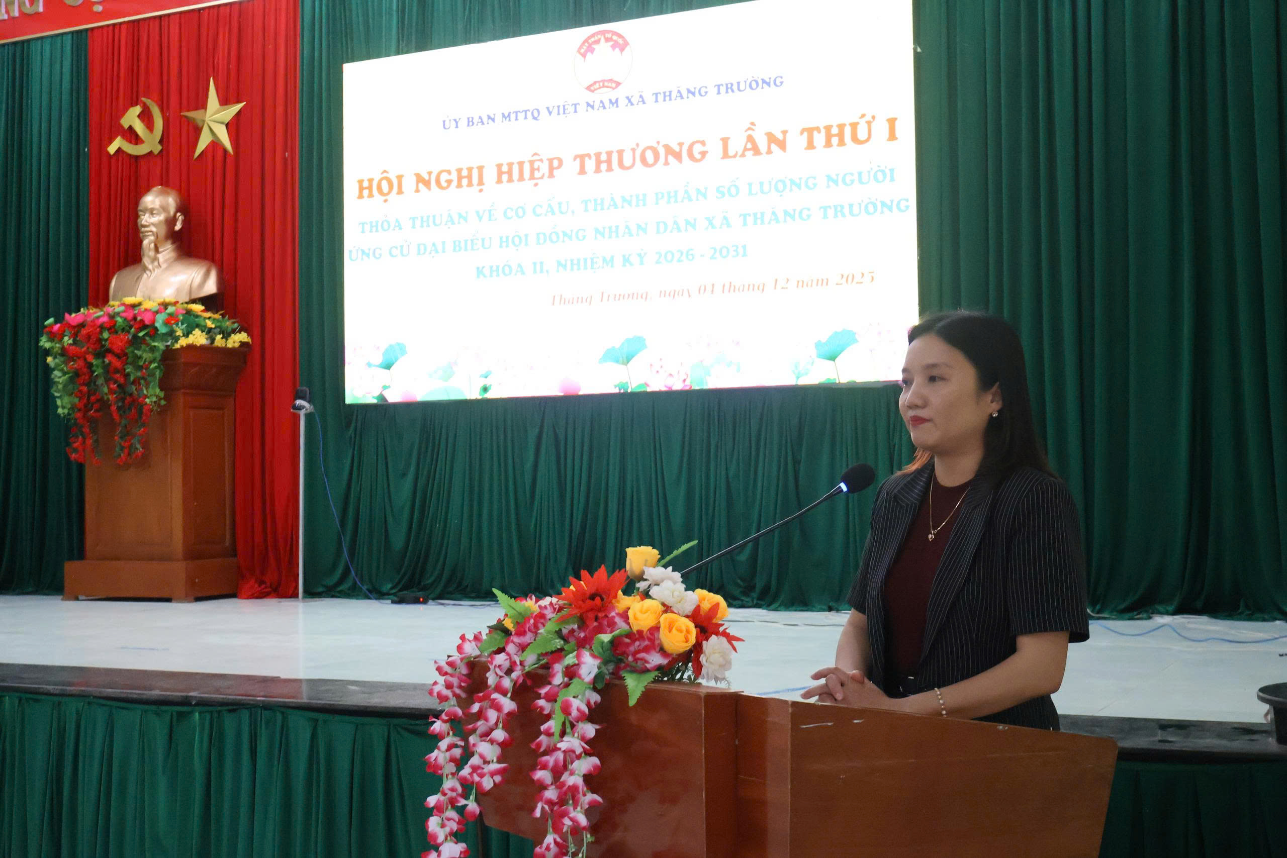 Hội nghị đã thảo luận, biểu quyết và thống nhất 100% về cơ cấu, thành phần số lượng đại biểu HĐND xã Thăng Trường khóa II, nhiệm kỳ 2026 – 2031. Bên cạnh đó, Hội nghị cũng đã biểu quyết thống nhất 100% về cơ cấu, số lượng ứng cử viên được giới thiệu ứng cử đại biểu HĐND xã Thăng Trường, nhiệm kỳ 2026 - 2031.